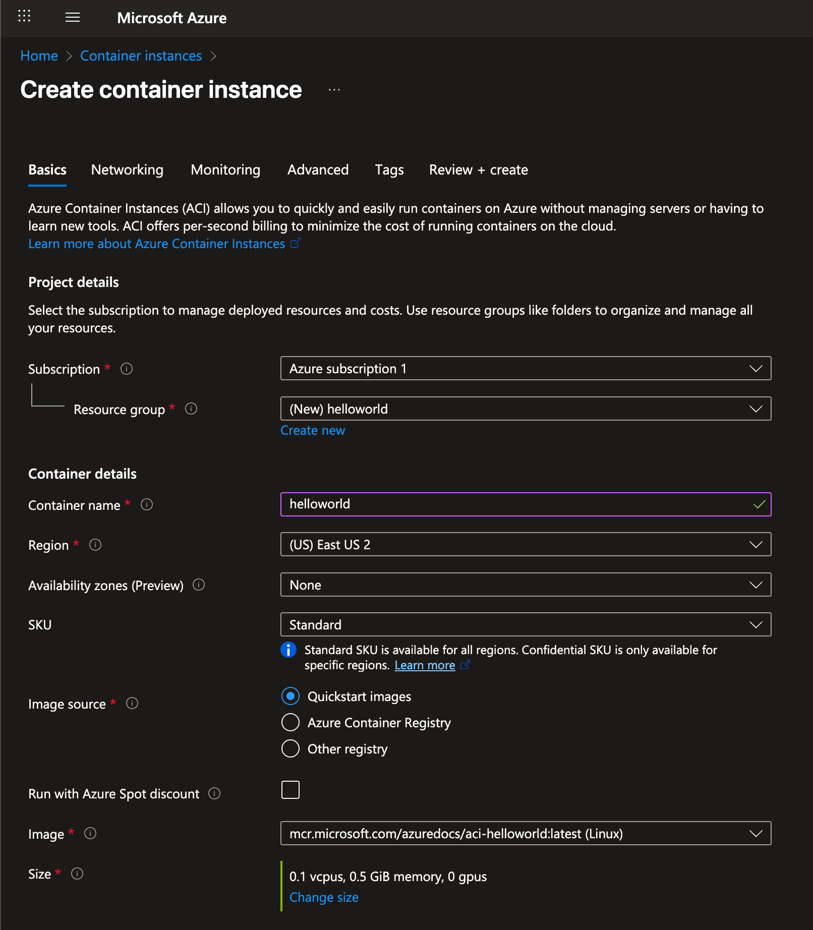 Anyway, whatever, who cares about limitations. It’s a Microsoft product, of course it has silly omissions. Let’s go over what you need to know to run a container in Azure Container Instances, run a Hello World, then build and run a custom Python script.