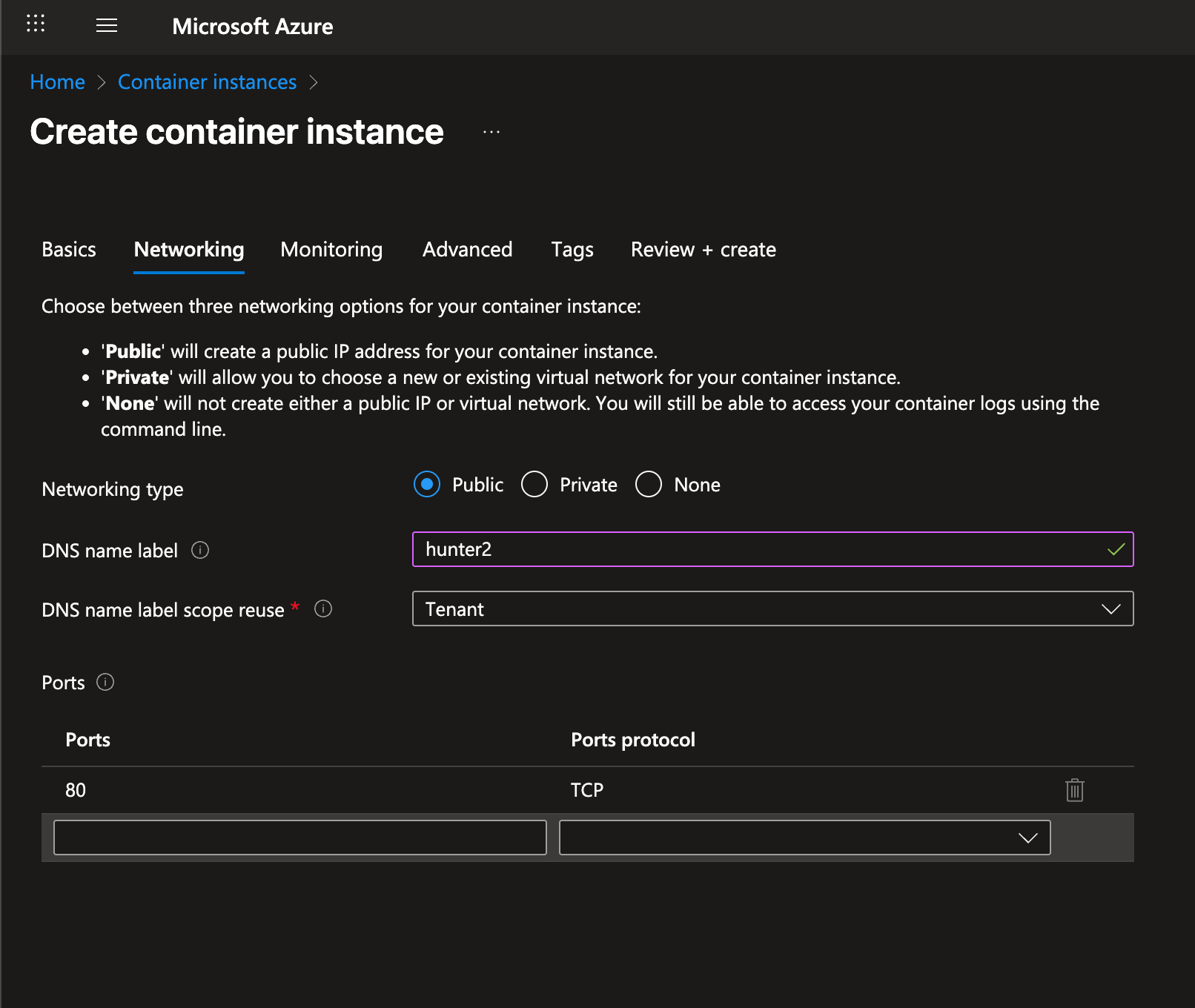 Clicking on to Networking, I’ll choose Public networking (which will create a public IPv4 address for my container) and select a DNS name. I’ll leave the default port 80 allow NSG rule in place.