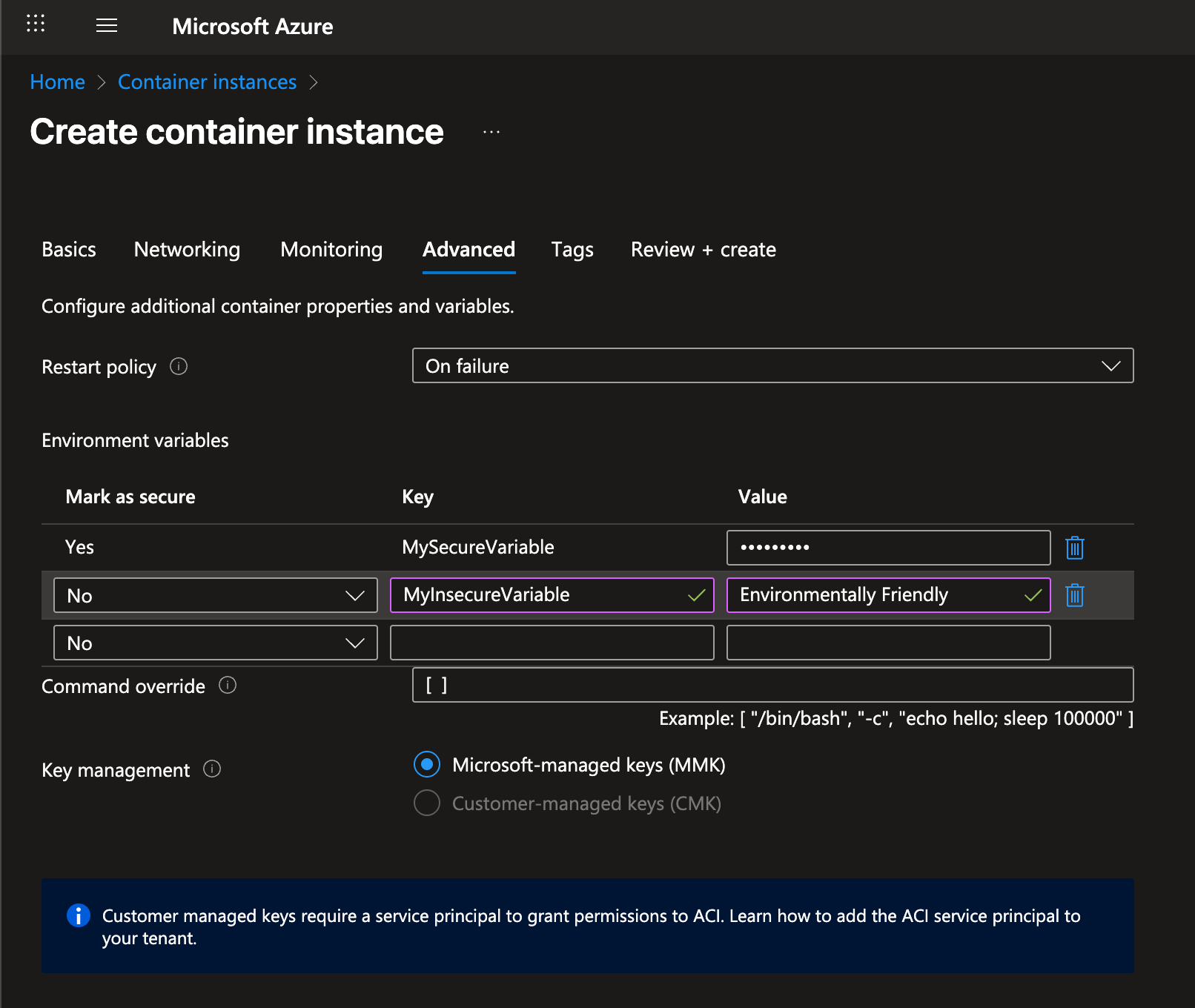 I’ll just turn off logging on the Monitoring tab so I’m not billed via another resource group. Then, under Advanced, I’m just going to make two environment variables for fun (they won’t do anything here). Note that you can also set the restart policy to Always, Never, or On failure (as pictured).