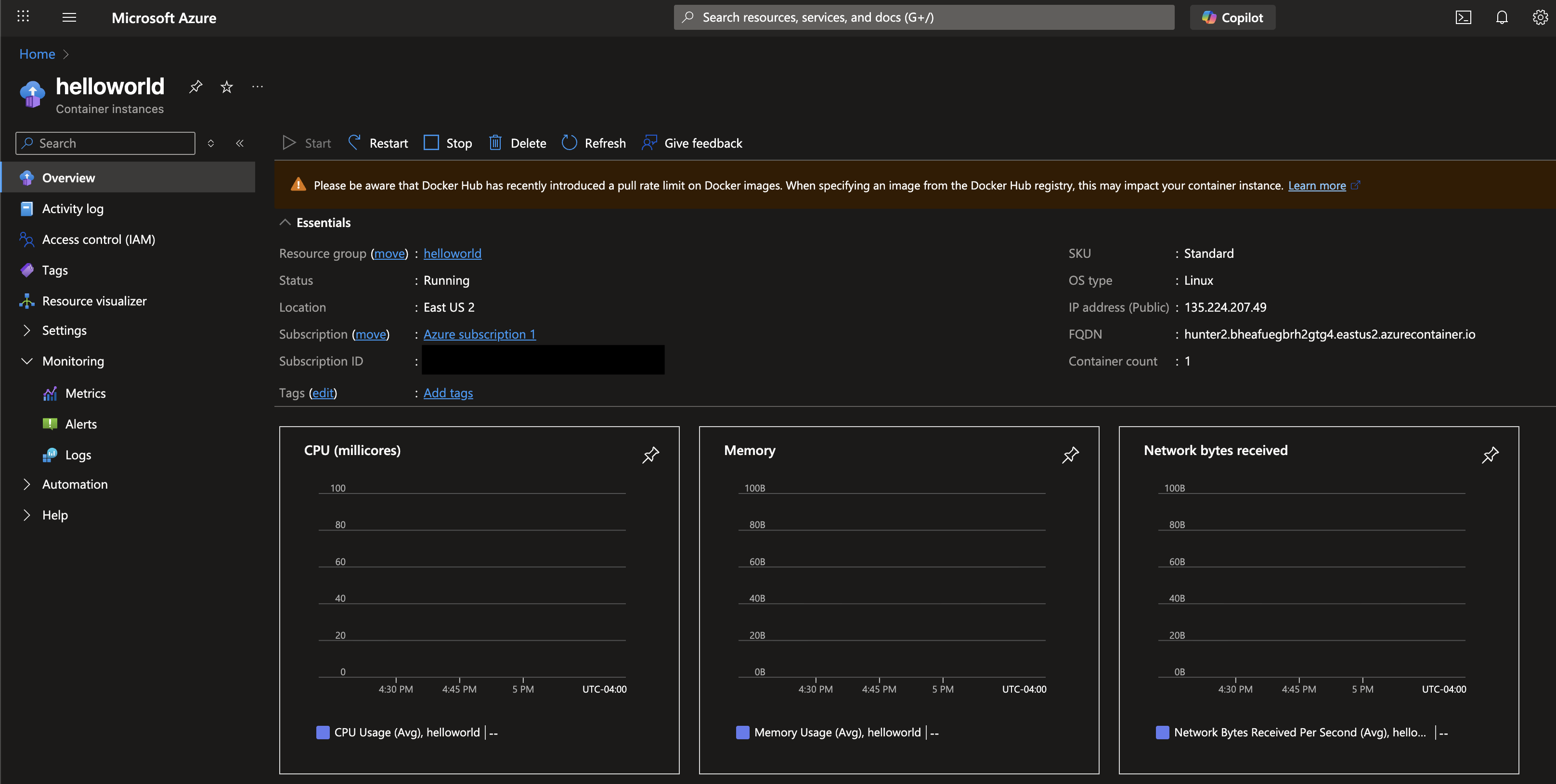 Note how we didn’t really have to think about anything but the container itself - that’s the main benefit of Azure Container Instances. It’s a great way to run a single or small number of simple containers that don’t need complex orchestration.