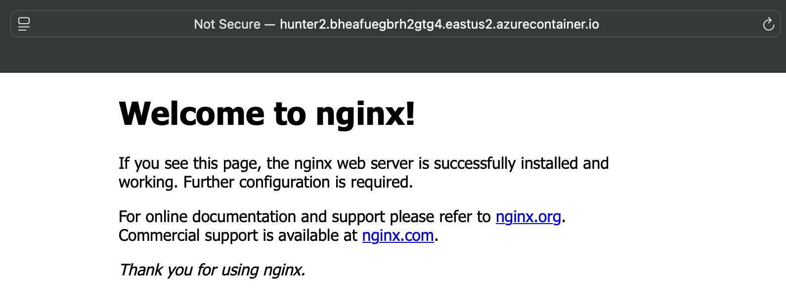 If I navigate to the FQDN or IPv4 address assigned by Azure, I’ll see the NGINX hello world page: