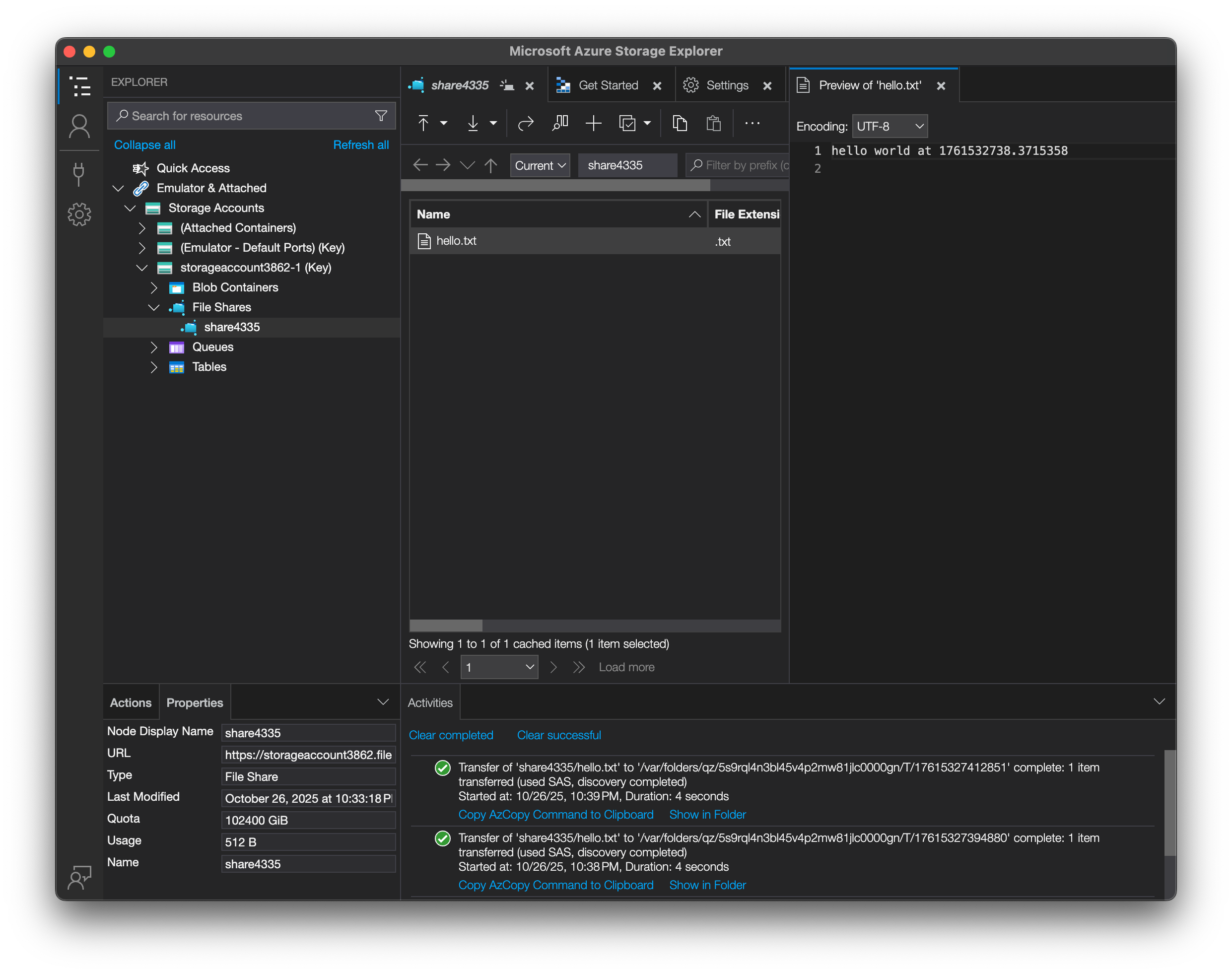 If I use Azure Storage Explorer to take a peek at the “hello.txt” file that we’re writing to, I can see that my Python script worked: