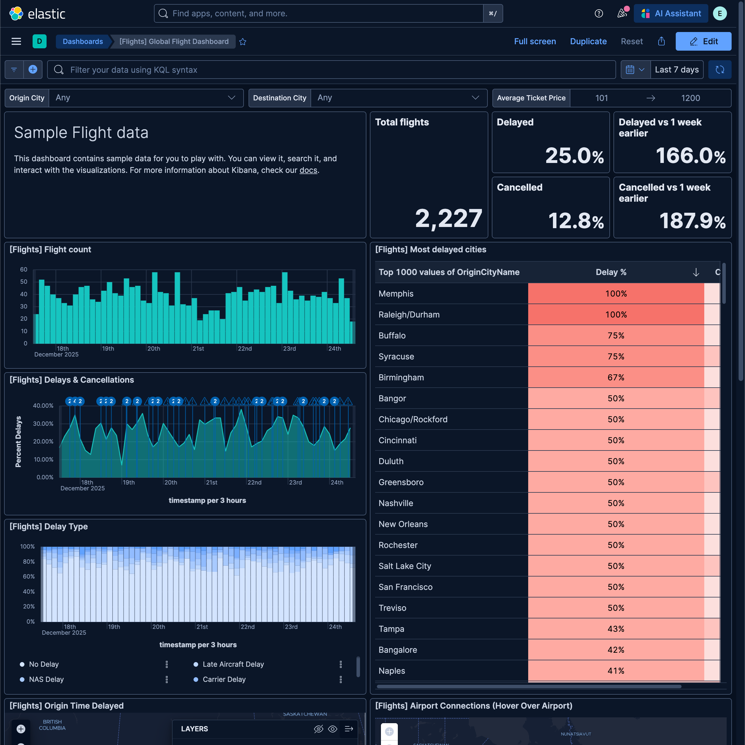 I’ve loaded the Flights sample dataset to the cluster with Kibana just to have something to look at.