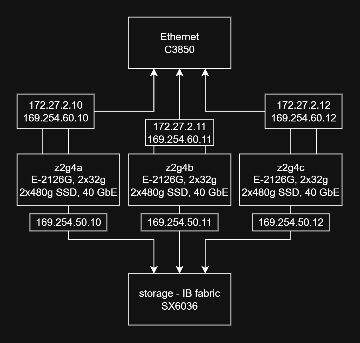 My switching needs will be handled by a Mellanox SX6036 Infiniband/Ethernet FDR/QDR/40GBe VPI switch and a Cisco 3850-48T gigabit Ethernet switch.