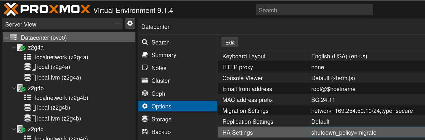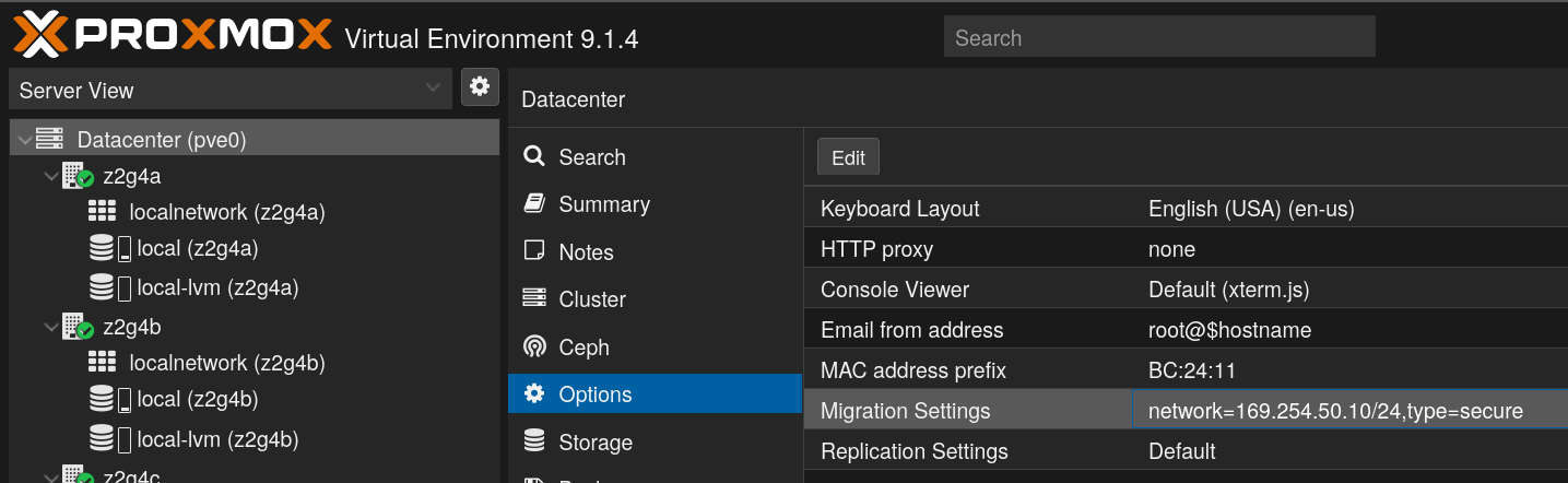 GlusterFS would have been my next stop rather than a small Ceph deployment, but it’s going the way of the dodo and the storage plugin was removed in PVE 9 (following a decision made by QEMU, upstream). Sad! It had worked pretty well when I used it in the past, though performance wasn’t incredible.