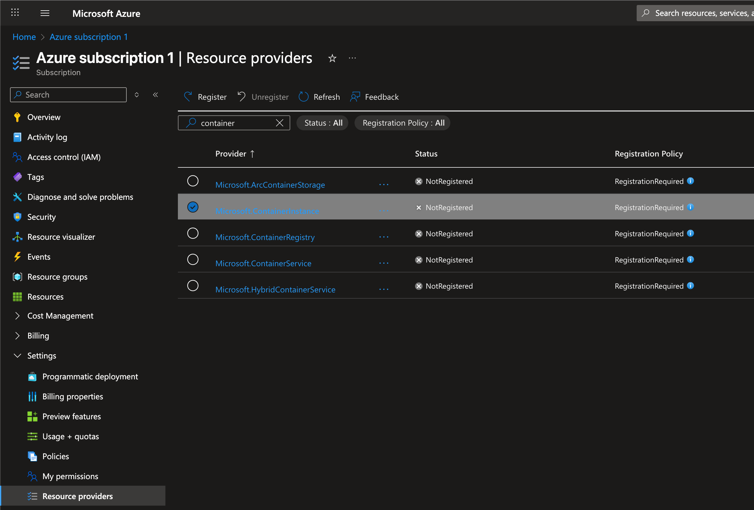 I want to activate the Azure Container Instances provider in a new Azure pay-as-you-go subscription (“Azure subscription 1”). So, I’ll navigate to my subscription (Subscriptions > ‘Azure subscription 1’) in the Azure Portal, then expand Settings in the left-side navigation pane, click ‘Resource providers’, and run a search for ‘container’. Breathe out. Lots of clicks.