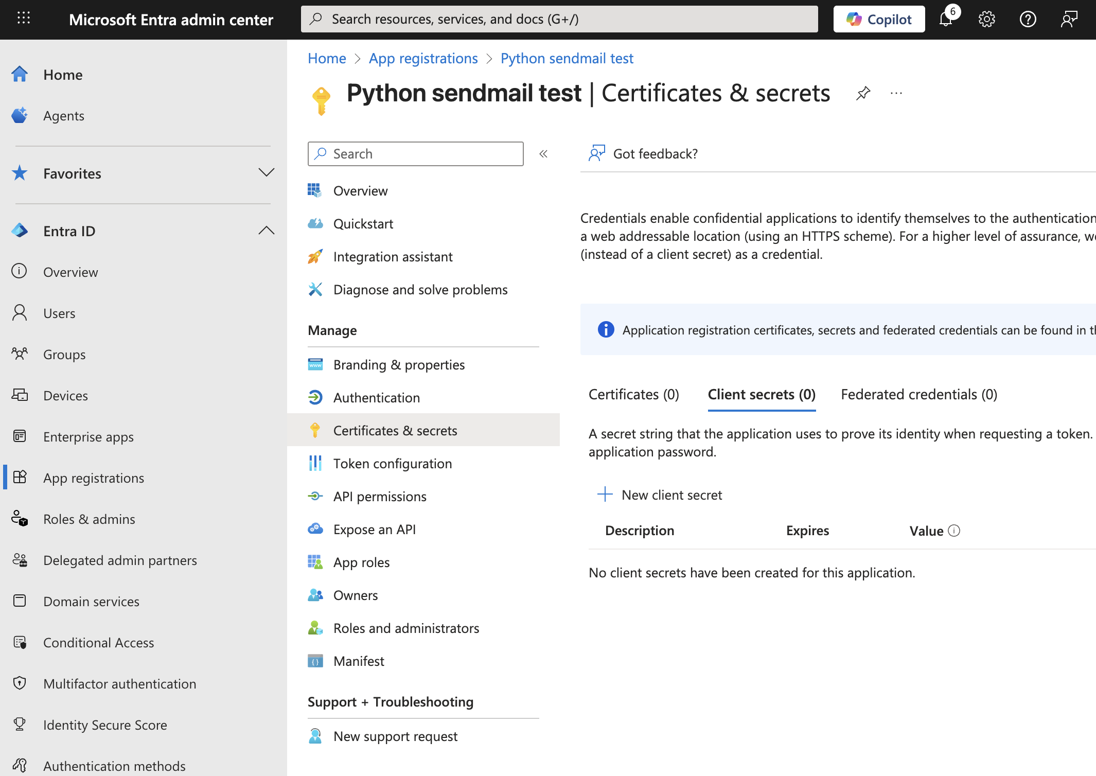 Next, create a client secret or upload a certificate that the app will use to authenticate with Microsoft Graph.