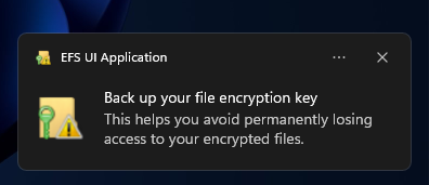Again, as Windows will tell you, BACK UP YOUR ENCRYPTION KEY before storing anything important in EFS-encrypted files!
