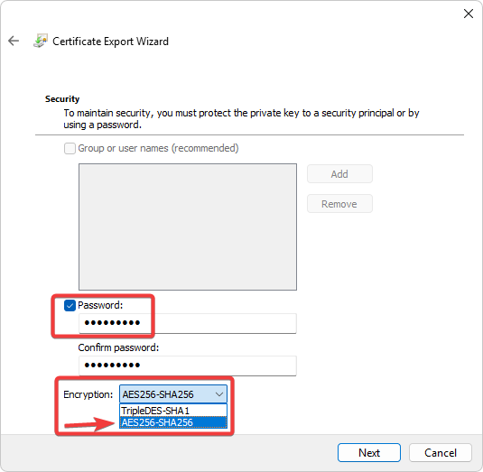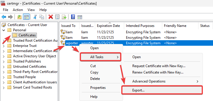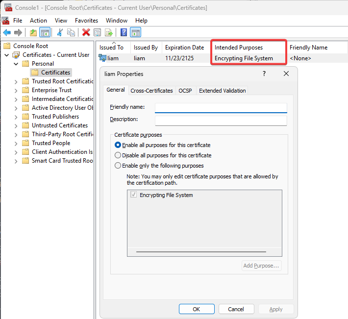 CAUTION!! This means that if your password is reset (e.g., an ‘unkind’ lusrmgr.mmc reset, or PowerShell) you may lose access to the private key! Make a backup of the private key and/or be sure you can restore encrypted files from a backup before storing anything important with EFS!