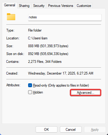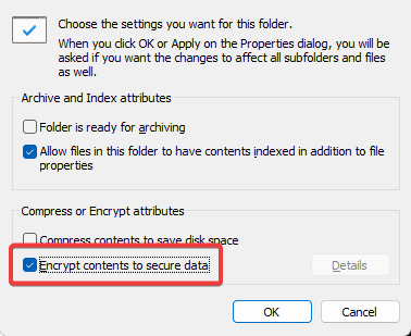 Then, under “Advanced Attributes”, check the “encrypt contents to secure data” option and click OK (in the Advanced window, and on the Properties window).