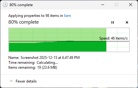 EFS encryption doesn’t hammer the computer; on a Ryzen 5 3500U running Windows 11 24H2 I saw about 5% CPU and 12 MB/s of disk from LSASS (highly scientific monitoring with Task Manager) after toggling the property on a ~3 GiB directory of small files.